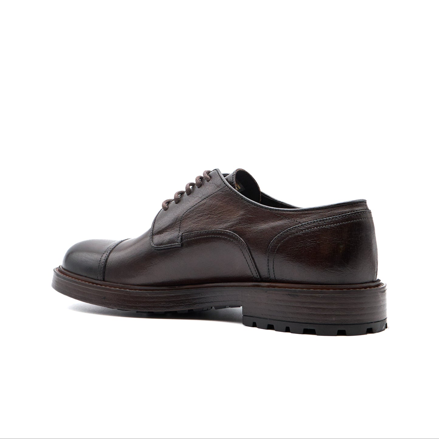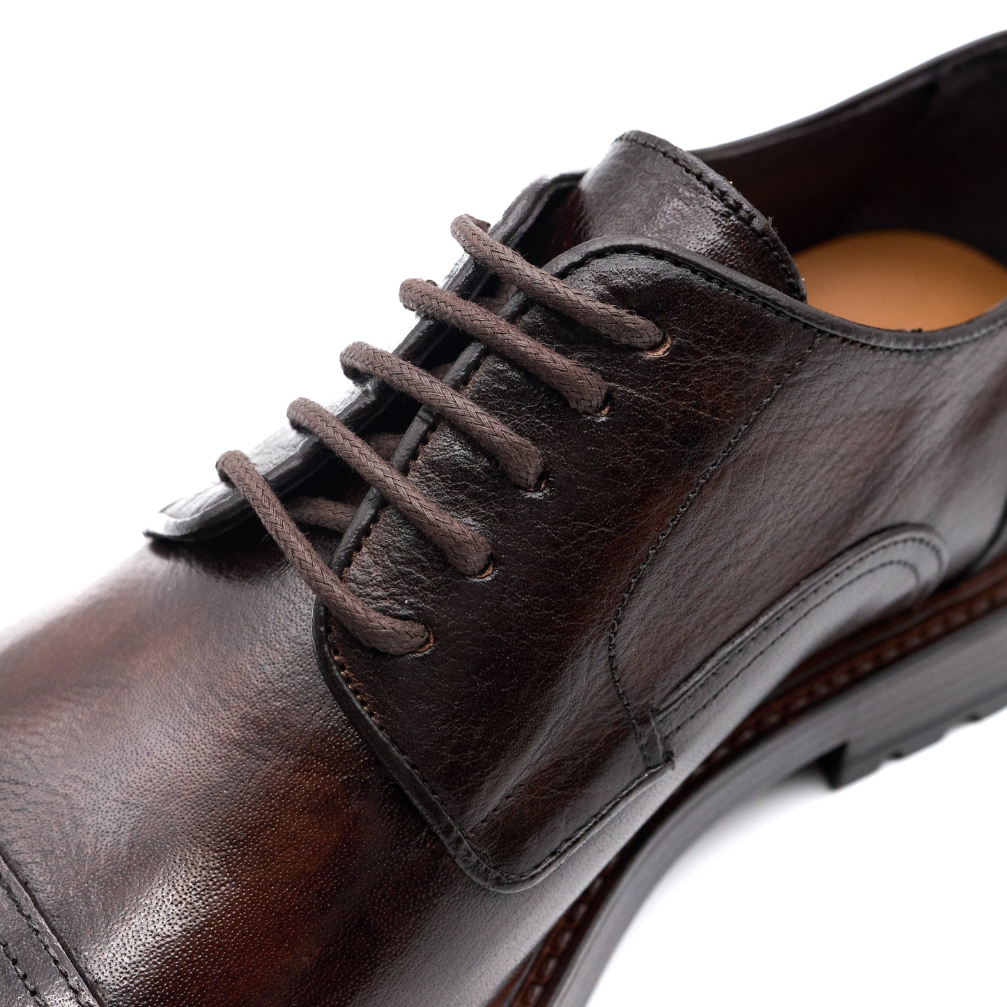 Derby dal design classico ed elegante è realizzato in Vitello Toscano di colore Castagno, un pellame pregiato che garantisce morbidezza e una finitura naturalmente lucida. La tomaia presenta linee pulite e cuciture a vista che ne esaltano la lavorazione artigianale, mentre l’allacciatura aperta tipica del modello aggiunge un tocco di versatilità e comfort.